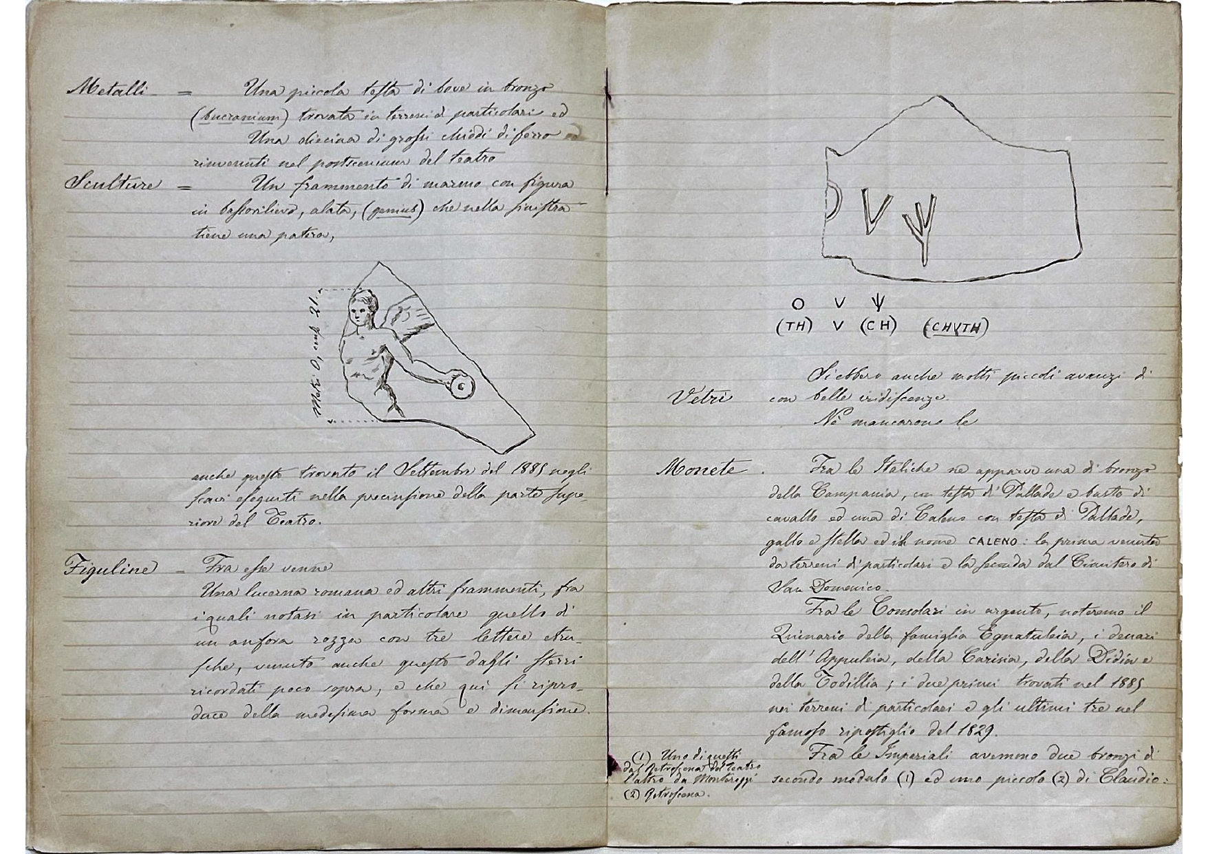 Le relazioni erano compilate su quaderni formato protocollo, spesso corredati di titoli guida a margine e disegni dei reperti archeologici. Le attività descritte, generalmente seguite dai rendiconti contabili dei lavori eseguiti e delle somme di denaro impiegate, erano firmate dal presidente della Commissione, il conte Francesco Zauli Naldi, dal 1879 al 1881 e dal direttore del Museo Civico, Demostene Macciò, dal 1885 al 1901. Oltre agli aspetti tecnici e archeologici, la lettura delle relazioni svela anche le dinamiche istituzionali e le difficoltà affrontate dalla Commissione nella gestione dei propri compiti, come dimostrano le parole introduttive della descrizione dell’attività svolta nel 1881 trasmessa al sindaco: «Quanto essa [la Commissione] operò in quei dodici mesi sarà per avventura al di sotto della aspettativa vostra, siccome lo fu dei desideri suoi, ma ne conforta il pensiero non si vorrà ascrivere a manco di zelo e di attività ciò che fu solo effetto di svariati contrari accidenti che superfluo sarebbe qui enumerare» (A.C.F., Postunitario, IV. Carteggio degli affari, 436, Relazione della Commissione archeologica per l’anno 1881).
